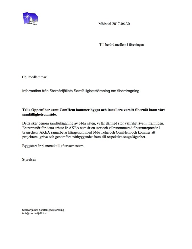 Kontakter har tagits både från Stornärfjället och AKEA vid upprepade tillfällen under sommaren för att få tillstånd ett samförläggningssavtal men dessvärre inte erhållit någon återkoppling som resulterat i fortsatta diskussioner med ComHem/Fibertjänst.