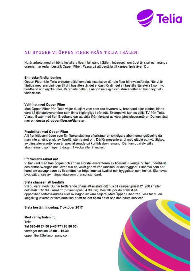 De medlemmar som tecknat avtal med ComHem/Fibertjänst uppmanas nu ta kontakt med Telia för att ta del av det erbjudande som tidigare gått ut inom Stornärfjället.